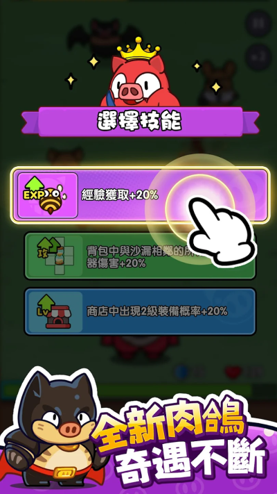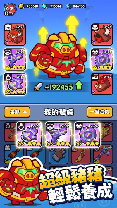 丰富的角色养成系统,令你的猪猪战士拥有无限可能。由外观到技能,由装备到属性,全方位制定你的专属角色,培养猪猪战士成长为独一无二的存在!