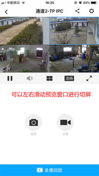单画面或四画面预览时,都可以通过左右滑动预览窗口进行切屏:
