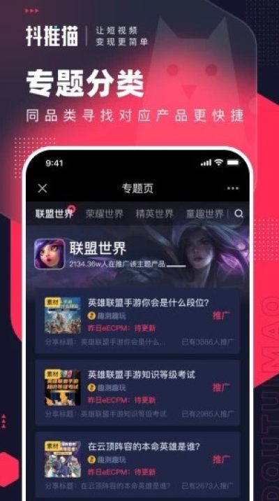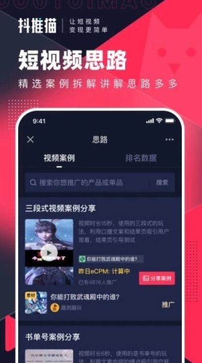 抖推猫app是一款安卓手机短视频推广平台,软件中有着海量的实用功能等你体验,用户可以在线推广不同类型的短视频,海量的视频推广教学指引,让短视频变现更简单!对软件感兴趣的话不妨点击下载试试!