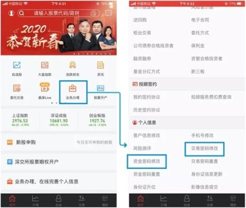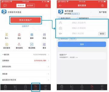 点击底部“交易”按钮,进入交易首页,再点击“登录交易账户”按钮即可输入资金账号、密码和验证码进行登录。