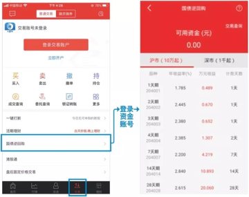 如果想要进行国债逆回购操作,您可以通过点击【交易】——【国债逆回购】来使用。国债逆回购主页展示沪深两市各逆回购品种实时行情列表,默认展示沪市列表。