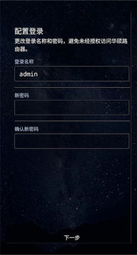 7、设置作为登录路由器设置页面的账号和密码,点击 下一步(默认账号密码可在机身贴纸查看)