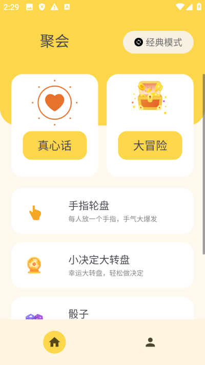 聚会大冒险app是一款安卓手机娱乐工具,用户可以选择不同的玩法进行体验,包含真心话以及大冒险等,非常适合多人派对聚会时打开畅玩,免费且无广告,对软件感兴趣的话不妨点击下载试试!