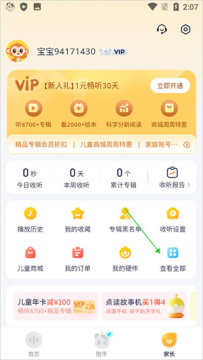 1、打开并登录喜马拉雅儿童APP,点击进入家长页面中点击【查看全部】(下图绿色箭头所指)
