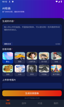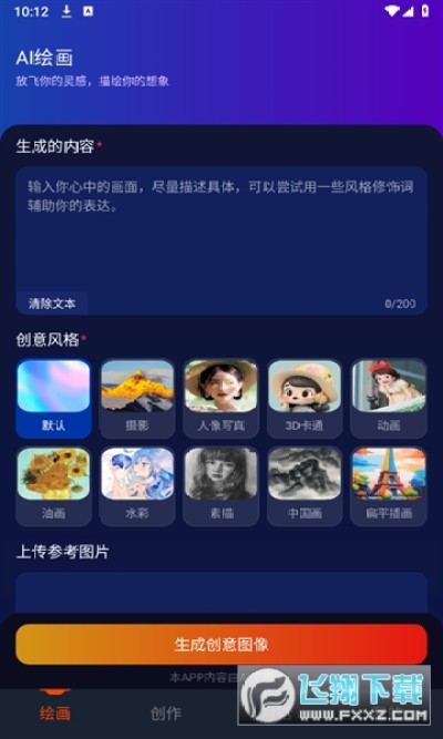 只需要在文本框,输入生成内容,任意选择创意风格,点击生成创意图像,即可快速生成喜欢的图片