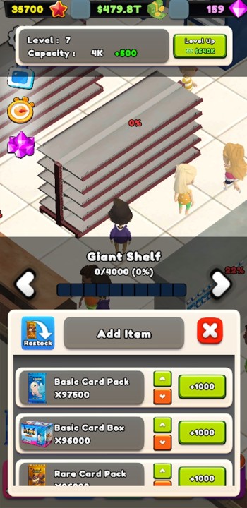 店铺一设好,顾客就会涌入。快速点击客户按钮以服务更多客户并通过销售卡包获得更多收入。每售出 1000 包,您就可以打开您的怪物集换式卡牌并将它们添加到您的集换式卡牌收藏中!提供出色的客户体验,这样您就可以在这个闲置的街机中建立一个真正的卡店大亨帝国。