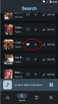 4、点击红心可以收获歌曲,+号是添加到播放列表。