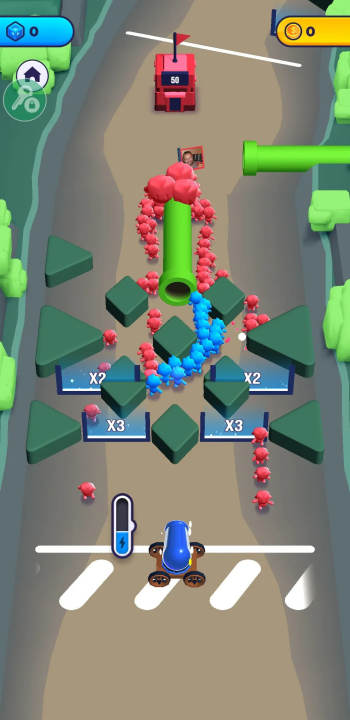 2、按住大炮不松手就可以源源不断地发射出炮弹人,炮弹人经过倍数门会获得数量上的增长,建议朝着倍数较高的门发射。
