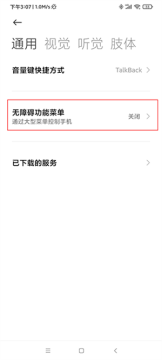 2、点击“辅助功能权限”后,找到“无障碍功能菜单”,是默认关闭的,需要开启;