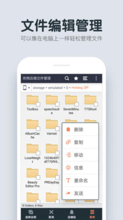 热狗压缩文件管理app是安卓上一款免费使用并具有文件压缩和文件提取功能的文件管理器应用! 支持非常多的格式,一键即可搞定,非常方便快捷