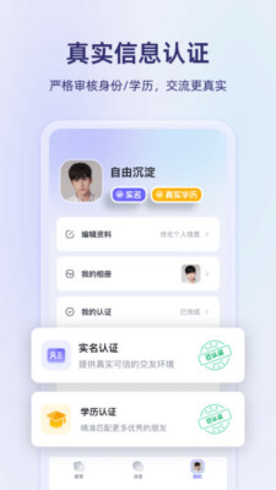每一位用户,都经过了严格的真实信息认证(实名认证、学历认证),前台对认证过的信息有明确标识,提高交流的真实性。
