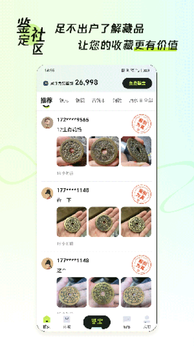 ‌鉴定社区互动‌:平台内设有鉴定社区,用户可以在此了解各类藏品的鉴别评估知识,与其他收藏爱好者交流心得。用户可以通过发布自己的藏品图片、鉴定心得或提问等方式参与社区互动和知识分享,从而不断提升自己的鉴赏水平和历史知识。