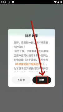 1、下载安装并打开听泉鉴宝app,点击同意,同意隐私政策