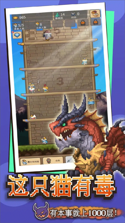 1、进入游戏后,玩家点击楼层即可召唤出勇者和士兵去打倒妖怪