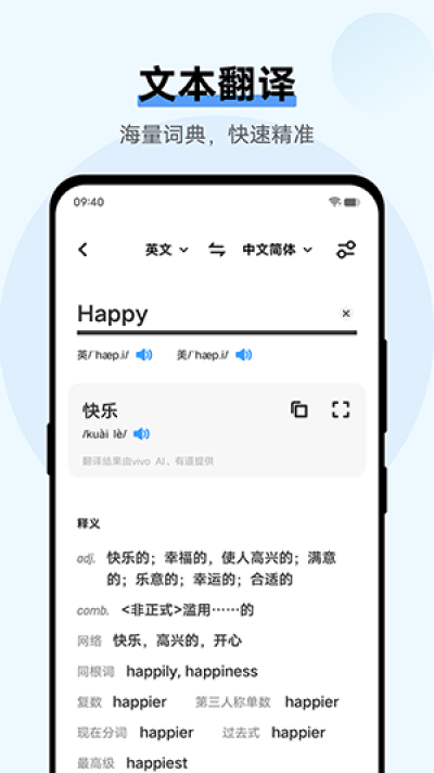 多功能翻译方式:无论是翻译单词、句子,还是通过文本、语音、拍照、同声翻译等方式,vivo翻译机APP都能轻松应对,为用户提供全方位的翻译服务。