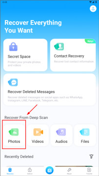 提供一键快速恢复功能,支持恢复照片、消息、视频、文件、联系人和音频等多种数据类型。