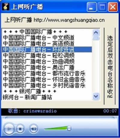 在影视资源的冲击下,网络电台并没有被大众遗忘。在出租车或者其他公共场合我们依然可以听到熟悉的频道,熟悉的声音。上网听广播是一款搜索功能强大,操作简单,稳定流畅的免费网络电台软件。可以收听免费网络电台近600个。正常收听需要系统安装windows mediaplayer 9.0 以上版本。某些网络电台服务器不稳定,可能会无法收听。