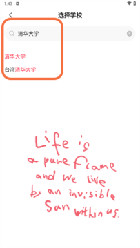 6、比如输入了清华大学,就会出现相关的学校,可以看到大陆和台湾的清华大学都出现了,由此可见天猫校园是对海峡两岸学生都提供服务的。