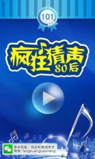 疯狂猜声80后是一款非常有趣的音乐游戏,游戏中玩家会先听到一段音乐,然后你将根据提示来猜这是哪首歌,游戏中拥有很多广告,电视剧和流行音乐的片段,赶快来猜猜看吧。
