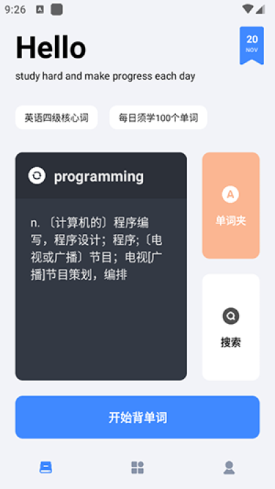 要背单词APP这是一款词典丰富,界面简单,方便用户提升英语能力的小工具,里面有四级、六级、六级英语、考研必备词汇,还有一个复习版块,可以让玩家在游戏中快速记住单词,既有趣,又实用。