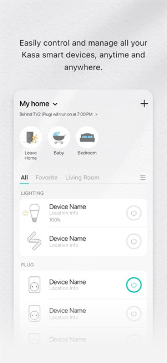 场景设置:为了满足用户多样化的生活需求,Kasa智能家居APP允许用户创建自定义的场景模式。例如,“回家模式”可以同时打开灯光、调节温度并播放音乐,为用户营造一个温馨舒适的回家氛围;而“离家模式”则可以一键关闭所有设备并启动安全监控,确保家居安全。