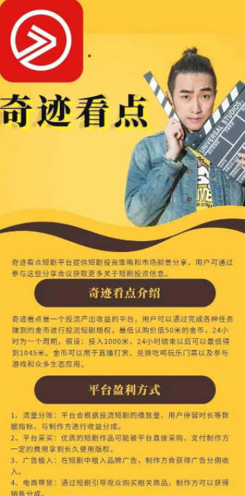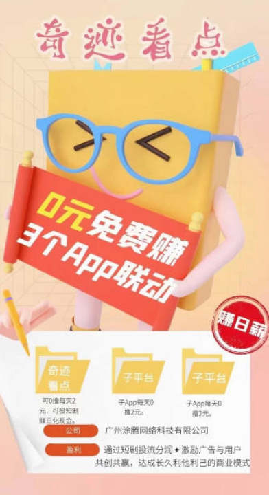 奇迹看点是由广州涂腾网络科技有限推出的短剧投流产品。软件包含广告、试玩、短剧投,每天0撸广告最低可撸6米