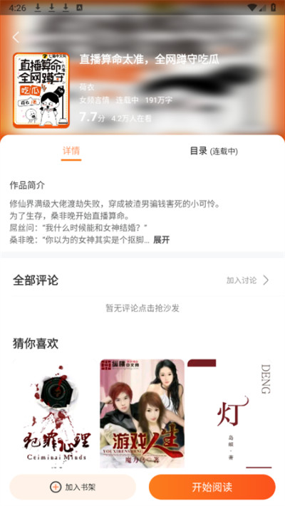 3、搜索成功后,进入详情页面,可以加入书架,也可以点击开始阅读