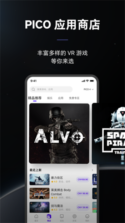 用户可以在应用商店中找到众多支持PICO一体机的游戏和应用,类型涵盖直播、运动、射击、休闲等多个领域;