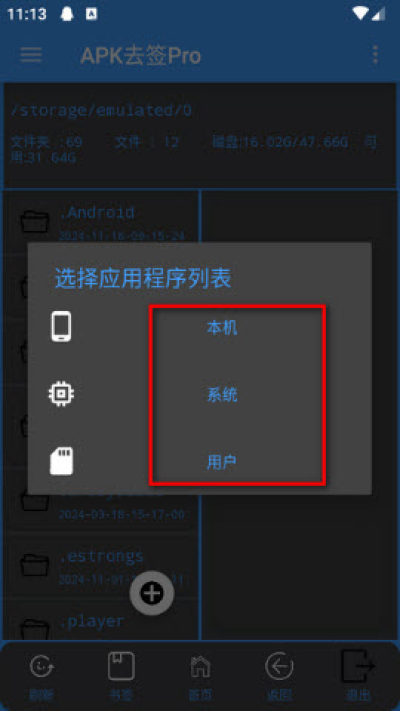 2.之后出现弹窗,可以选择【本机】,【系统】,或者sd卡上的【用户】;