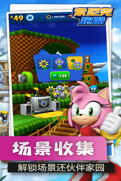 进入索尼克的世界,划动屏幕,操控索尼克或者他的伙伴跳跃翻滚和左右移动。帮助他们收集金环和金币;拯救朋友,闯过重重难关;打败蛋头博士等等..。