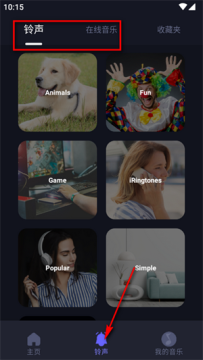 1、打开软件下方的铃声界面,可以看到铃声以及在线音乐