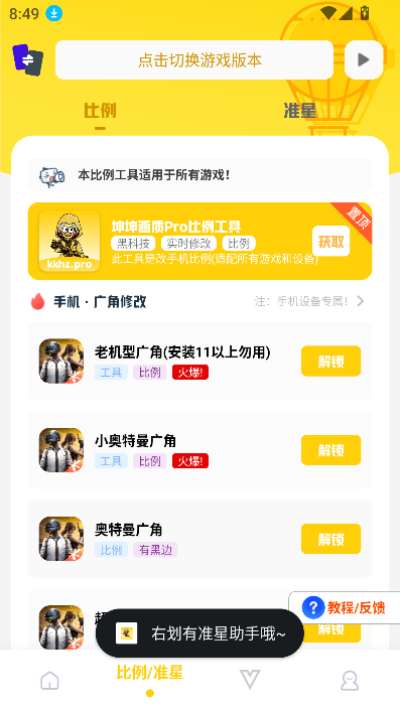 游戏辅助:除了画质优化外,坤坤画质Pro还提供了准心助手、陀螺仪超频等辅助功能,帮助玩家更好地进行游戏。例如,它可以帮助玩家轻松提升游戏画面质量,享受更流畅、更刺激的游戏体验。