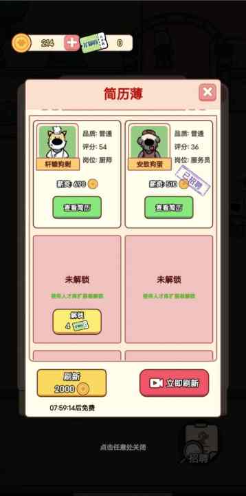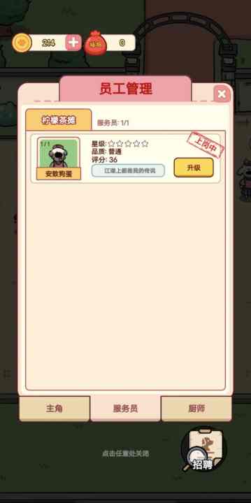 随着餐厅的逐步发展,单靠一只狗狗的力量显然不足以支撑整个餐厅的运营。你需要开始招聘员工,包括服务员、厨师、清洁工等各类角色。每个员工的能力、工作效率和忠诚度都不同,合理安排每位员工的工作,才能让餐厅运行更加顺畅。