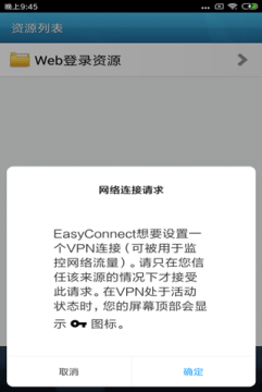 3、第一次登录VPN可能会弹出如下英文提示,选择“Allow”。随后会自动跳转至网络连接请求界面,点击“确定”完成验证。