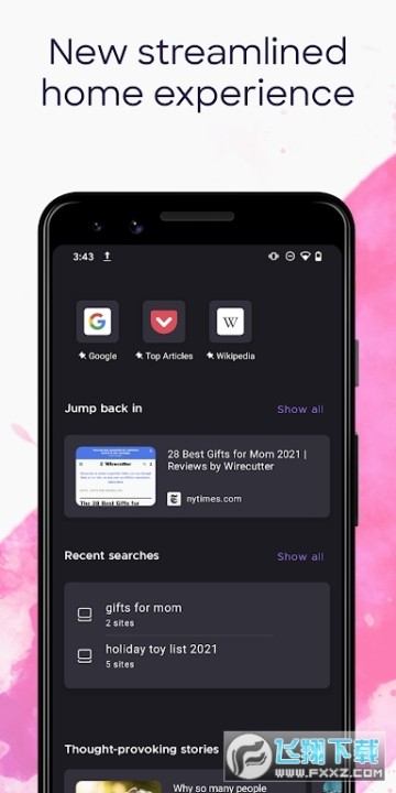 Firefox for Android拥有一个全新的,流线型的外观和个性化的开始页面,让用户可以在移动设备上迅速找到自己需要的入口。