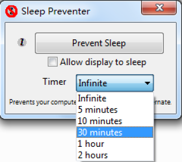 只需选择 Sleep Preventer 的 Timer 为无限禁止、或 5 分钟到 2 个小时,在此时段内禁止,勾选是否显示器睡眠即可。