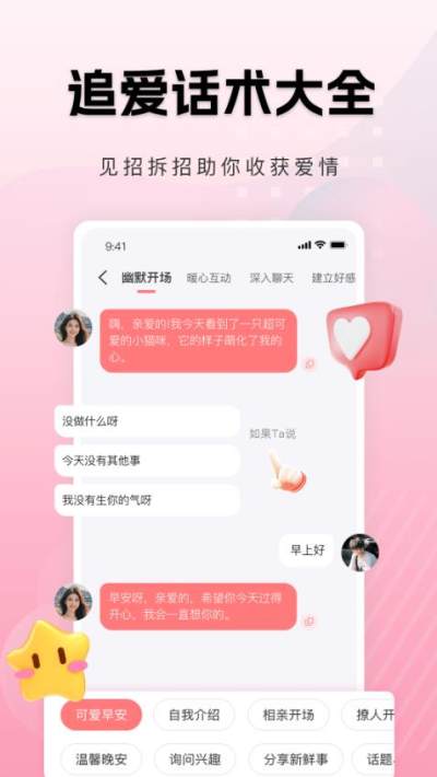 点点即甜app是一款安卓手机免费聊天交友软件,在这里有着海量的追爱话术大全,适用于不同的聊天环境当中,包含幽默开场、暖心互动以及深入聊天等,逐步帮你建立好感度,对软件感兴趣的话不妨点击下载试试!