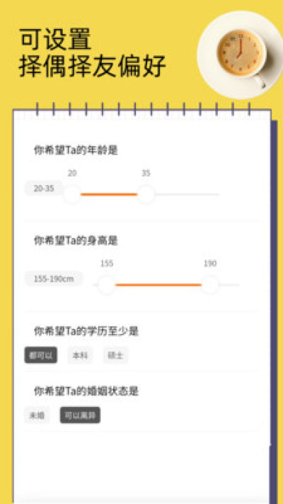 依见:不聊天,直接见。【本硕博脱单 | 三重身份认证 | 大城市均可匹配】。禁止线上聊天和加好友。单身男女在程序智能就近分配的咖啡厅见面的相亲模式。禁止未成年人注册使用。