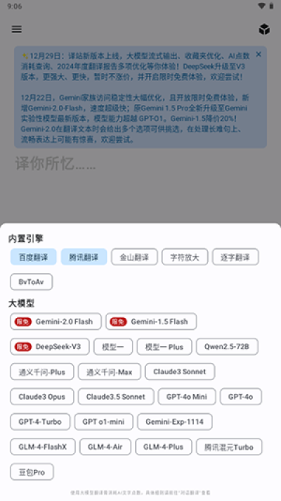译站APP一个AI翻译整合软件,这个软件将国内外热门的翻译引擎工具整合到此软件中,生成一个新的翻译软件,此软件为开源软件,支持使用百度,有道,金山,通义等各种AI工具进行翻译内容,翻译的内容十分的准确。