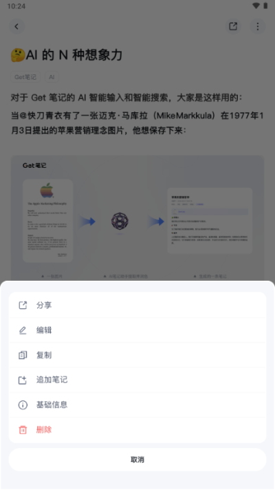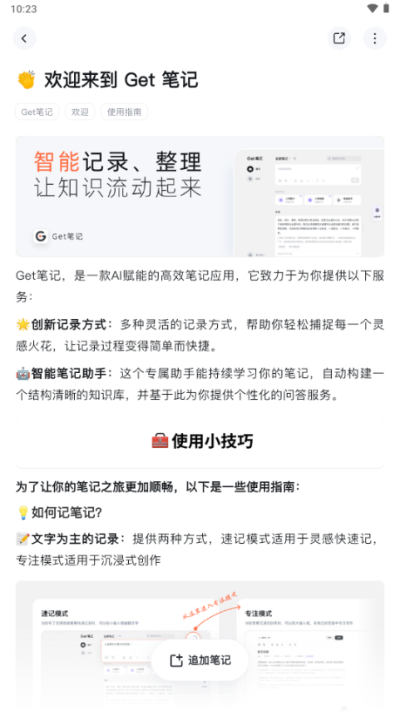 get笔记app是一款ai笔记记录创作工具,软件界面简洁直观,所有功能齐全且免费,用户可以在线记录各种信息资讯内容,还可以插入图片,智能ai工具帮助你润色笔记,对软件感兴趣的话不妨点击下载试试!