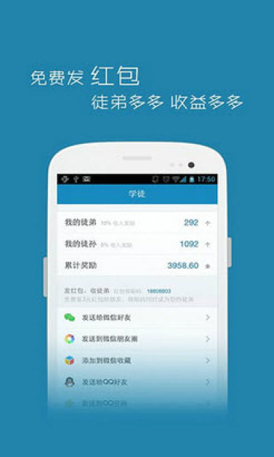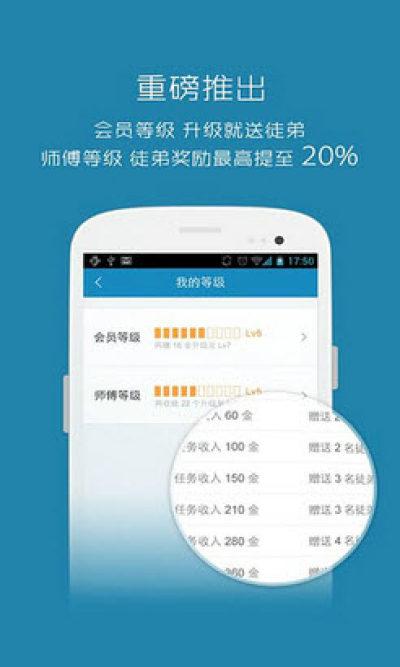 徒弟分成:您发展的徒弟与您徒弟发展的徒弟(你的徒孙),其所做的任务,都将获得最高20%的现金奖励(此奖励由钱咖官方补贴)。