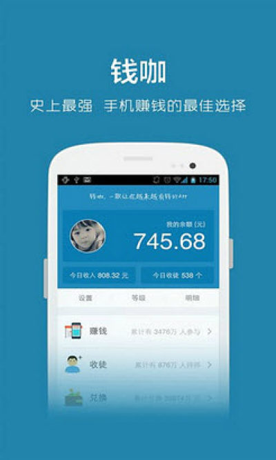 钱咖,一款能赚钱的APP,一款让你越来越有钱的APP。钱咖赚钱,最好的安卓体验互动激励平台。。钱咖赚钱会不时的发布一些有意思,好玩的任务。小伙伴们通过完成指定的小任务,来获得现金和实物奖励,浏览文章回答问卷调查收藏店铺等等体验游戏试玩 小伙伴们,赶紧来玩吧!