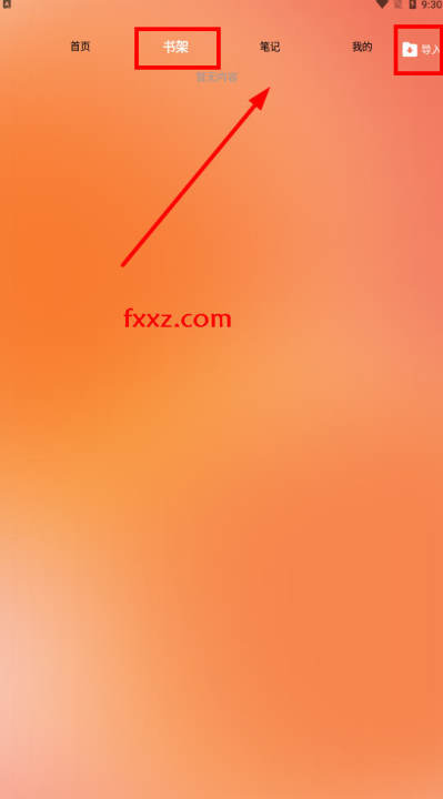2、点击最上方的‘书架’板块,找到最右侧的‘导入’;