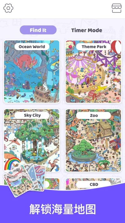 ✅ 多种难度,眼力挑战。隐藏物品被找到的越多,你可挑战的地图场景也越多、越难。
