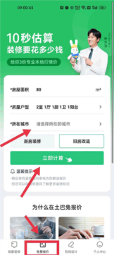 点击新房装修下方免费估价,再选择要装修的房子面积以及所在城市就可以估算报价啦,方便又快捷;