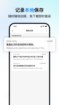 - 历史记录:为你自动保存录音和双语翻译记录,数据本地备份存储,守护你数据安全,方便你随时复盘,并导出和分享音频和记录。