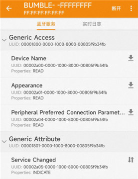 1、首先在本站下载安装好BLE蓝牙助手,返回界面打开软件。到BUMBLE这个设备,点击连接,连上之后,就会看到4个蓝牙服务,实时日志里也会看到连接状态的提示。