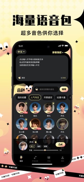 音阅app是一款一键配音的音乐平台软件,软件中有着海量的实用功能等你体验,用户可以随时随地搜索自己想要的音色进行配音操作,包含各种青年音、少年音等等,对软件感兴趣的话不妨点击下载试试!
