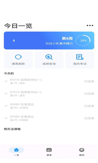 用户可以通过APP查看本学期的课程安排,包括课程时间、上课地点以及授课教师等详细信息。