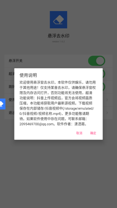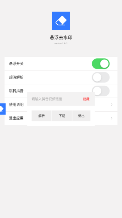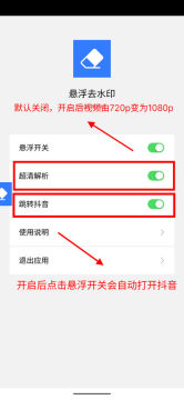 2、开启后,视频清晰度将从720p提升至1080p,开启悬浮框权限后,点击悬浮开关会自动跳转到抖音APP。